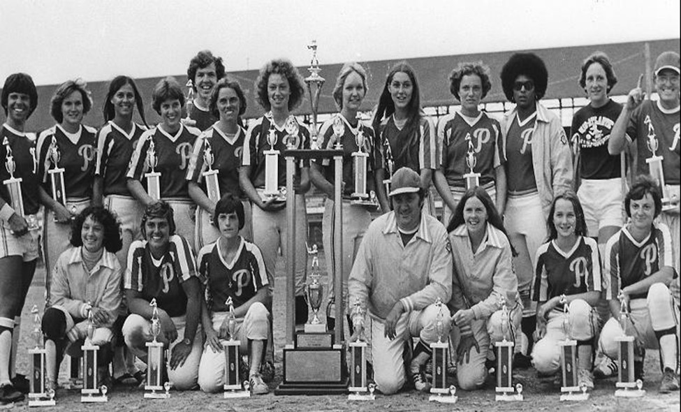 The road to the 1977 Womens's Class 'A' World Championship was anything but smooth for the Pace Fighting Green and Gold team - at least until the team arrived at the World Tournament. It had to overcome several problems along the way, play a record 98 games - of which it lost a record 20 games - lose 4 league games (still won the league), and played in a record 12 tournaments. It did win half of those tourneys. But in the end, it did something that even the great World Champion Muxworthy's Ski-Haus F G & G team of 1972, which lost only 4 games, didn't do - go undefeated in the World Tournament. The 2 Championships were the highlight of the 13 year 'big ball' era in which the Fighting Green and Gold was the only team in the country to play in all thirteen. It never finished out of the top ten. Along with the 2 World Titles came 2 runner-up finishes, 1 third, 1 fourth, 2 fifths, 1 seventh and 4 ninths. Mildred Burrell, the former USSSA women's National Director, called the Fighting Green and Gold the greatest and most decorated team of the USSSA Big Ball Era (1969-1981). The 1977 team had a giant share of that remarkable World Tournament history.